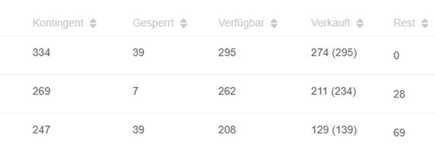 Verkauft: Alle verkauften Plätze von einem spezifischen Tickettyp. Es ist dabei unerheblich, ob der Verkauf im Webshop oder intern erfolgt ist. Falls dabei auch Tickets eines sogenannten Child-Price verkauft werden (zb. Kinder- oder Studierenden-Tickets), dann wird die gesamte Anzahl in Klammern gesetzt und der spezifische Tickettyp ohne Klammern. Sobald Sie diesen Tickettyp anklicken, sehen Sie die Verkäufe an Child-Price-Tickets.